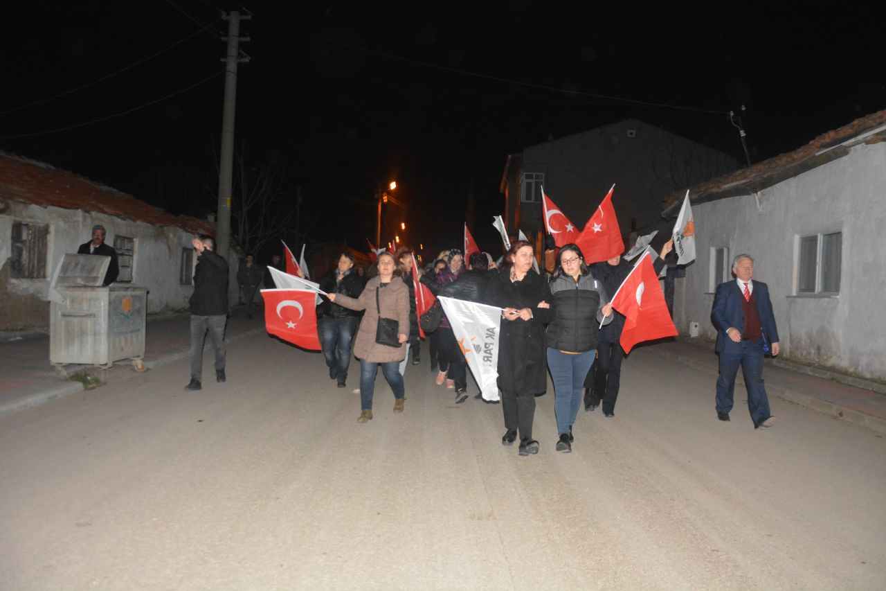 AK Parti’nin seçim bürosunda toplanan AK Partililer saat 21.00 sıralarında Bayrambey mahallesinden başlayarak çarşı içinden Köprü Mahallesine doğru yürüyemeye başladılar. Vatandaşların ilgisine neden olan Kerman, işyerlerini ve kahveleri dolaşarak selamlaştı.