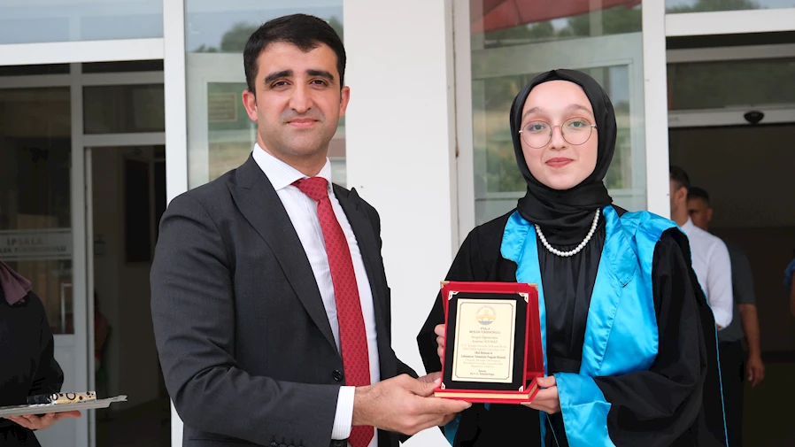 Tören, dereceye giren ve mezun olan öğrencilere plaket ve diplomalarının verilmesinin ardından meslek andının okunması ve kep atma töreniyle sona erdi.