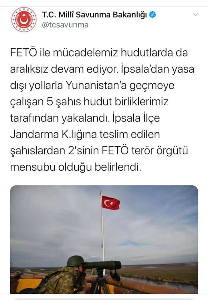 Bakanlığın Twitter'daki hesabından yapılan açıklamada, "FETÖ ile mücadelemiz hudutlarda da aralıksız devam ediyor. İpsala'dan yasa dışı yollarla Yunanistan'a geçmeye çalışan 5 şahıs hudut birliklerimiz tarafından yakalandı. İpsala İlçe Jandarma Komutanlığına teslim edilen şahıslardan 2'sinin FETÖ terör örgütü mensubu olduğu belirlendi" denildi.