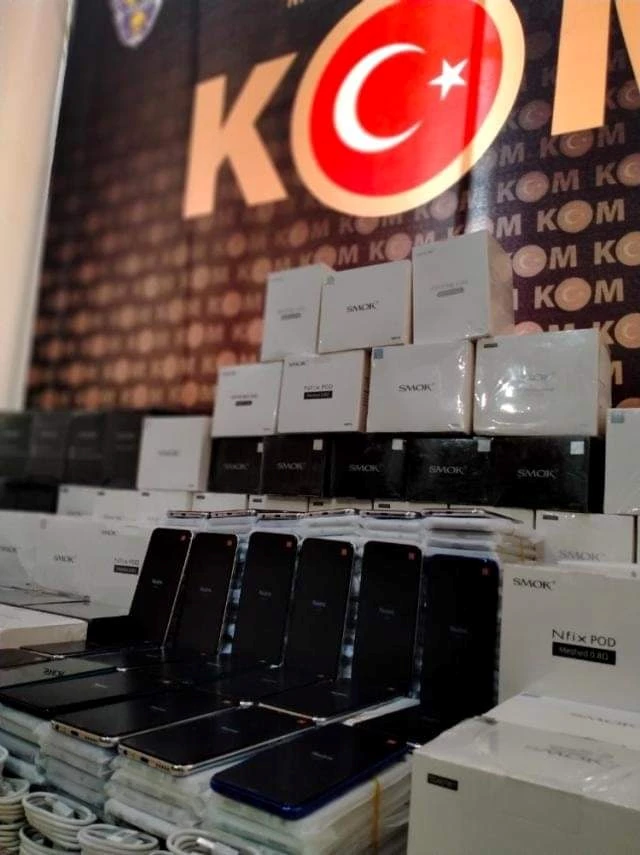 psala"da bir evde yapılan aramalarda, binlerce kaçak elektronik sigara, cep telefonu, simkart ele geçirildi.