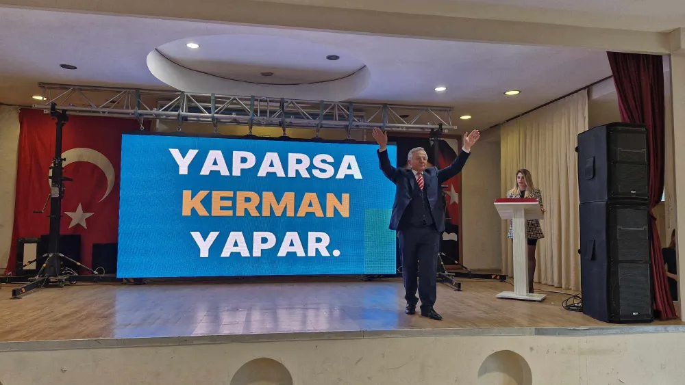 Alkışlar ve sloganlar eşliğinde kürsüye gelen AK Parti Belediye Başkan adayı Mehmet Kerman, projelerini slayt sunumu eşliğinde gerçekleştirdi.
