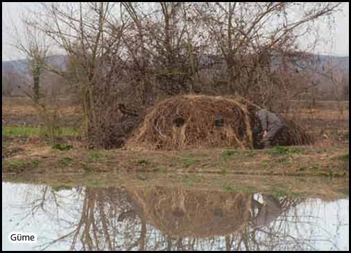 “Sulak sahalarda (Ormanlık alanların dışında) su kuşu avcılığında kullanılmak üzere; saz, kamış, diken, ot, çuval vb. doğal malzemelerden yapılmış ve alttan su girmesini engellemek amacıyla metal malzemeyle desteklenmiş taşınabilir gümeler kullanılabilir. Bu malzemeler dışında betonarme, yığma tuğla vb. yapılan güme özelliği taşımayan sabit yapıların avda kullanılması yasaktır.