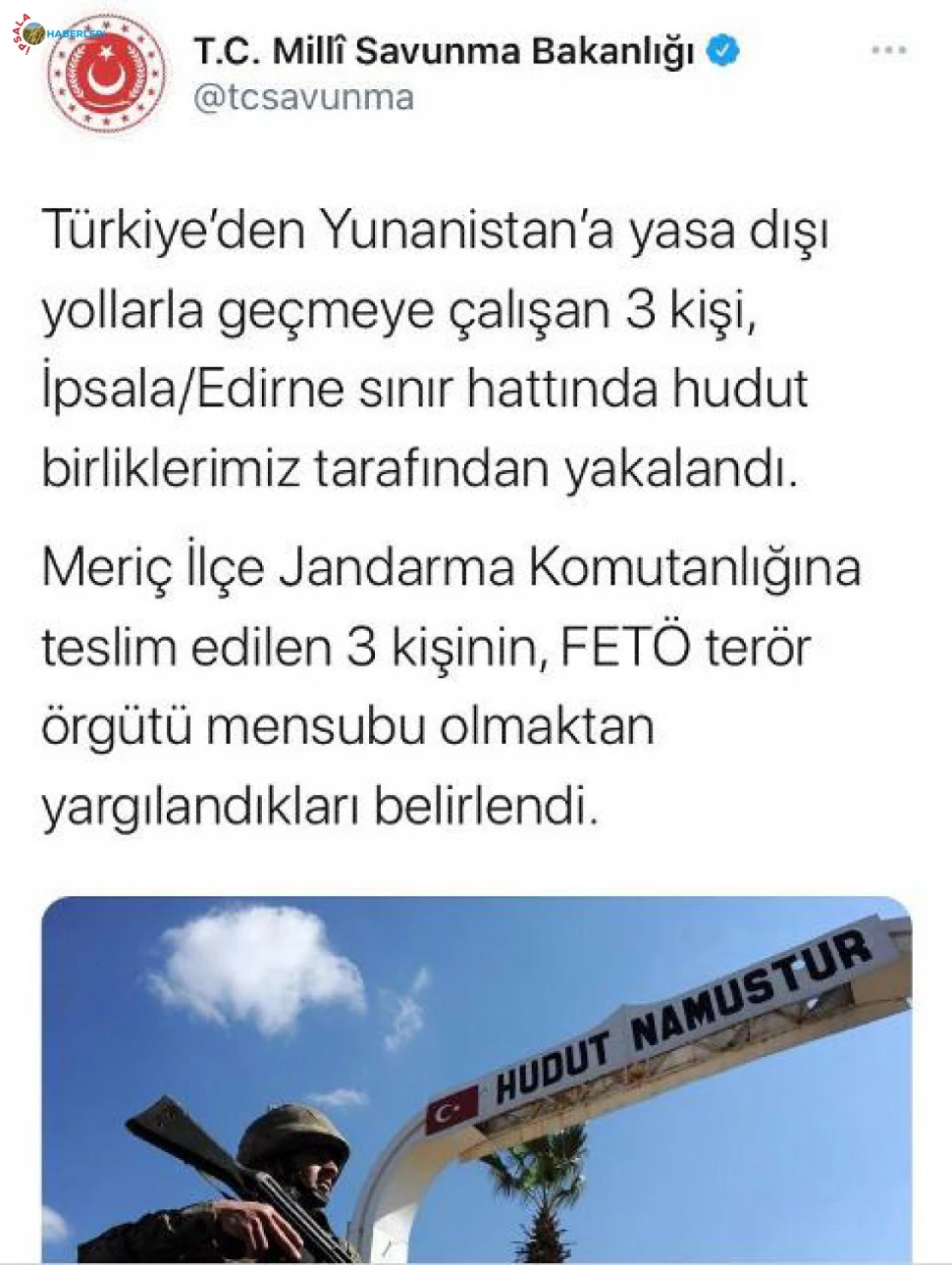 Bakanlığın Twitter hesabından yapılan açıklamada, "Türkiye'den Yunanistan'a yasa dışı yollarla geçmeye çalışan 3 kişi, İpsala/Edirne sınır hattında hudut birliklerimiz tarafından yakalandı. Meriç İlçe Jandarma Komutanlığı'na teslim edilen 3 kişinin, FETÖ terör örgütü mensubu olmaktan yargılandıkları belirlendi" denildi.