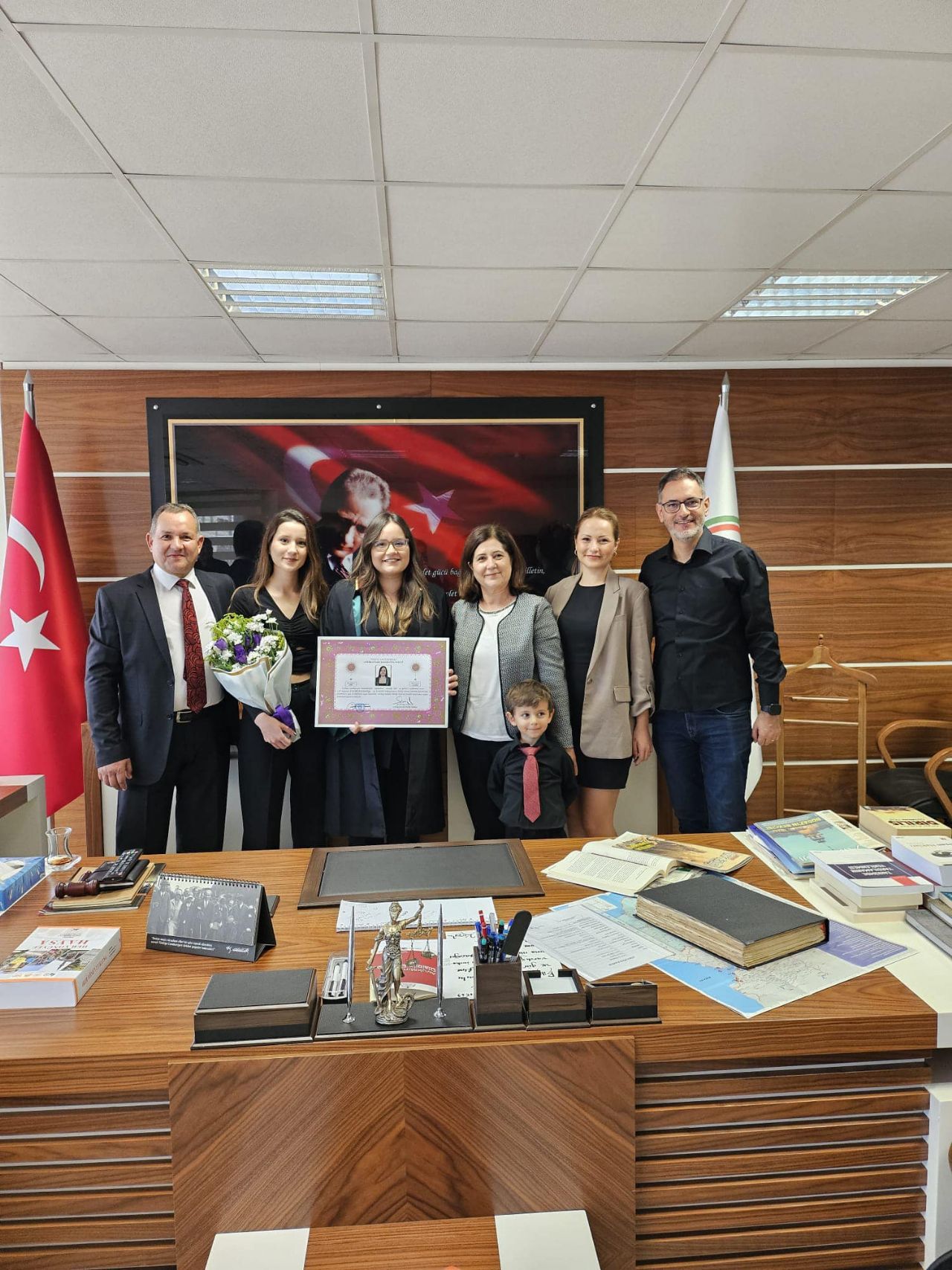 Avukatlık yemini eden Aybüke Darısapı’na ruhsatı Baro Başkanı Avukat Gökhan Karakoç tarafından verilirken, cübbesi yanında staj yaptığı Avukat Göksel Ertoga tarafından giydirildi.