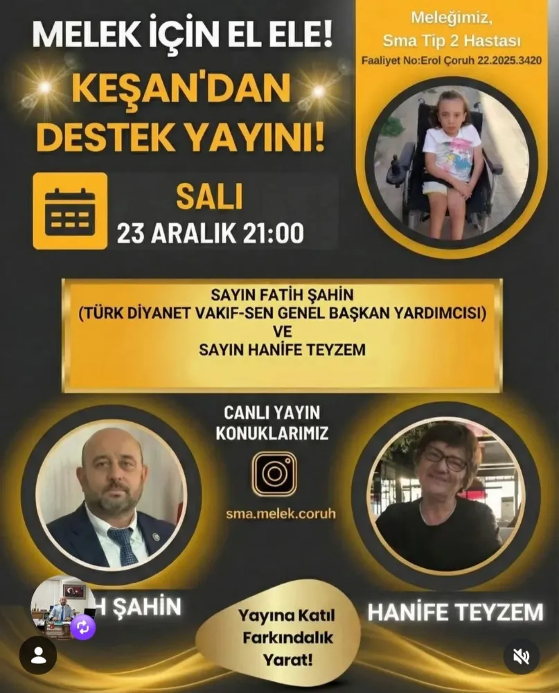 Canlı yayının konukları arasında Türk Diyanet Vakıf-Sen Genel Başkan Yardımcısı Fatih Şahin ile Hanife Teyze yer alacak. Yayın, Instagram üzerinden @sma.melek.coruh hesabı aracılığıyla canlı olarak izlenebilecek.